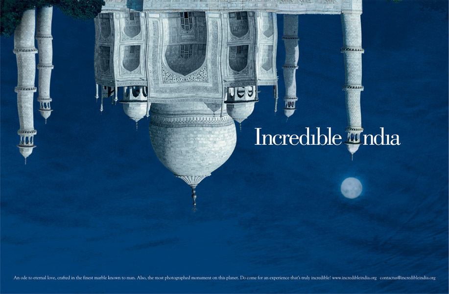 A good example of these principles can be found in the following print ads from the ‘Incredible India!’ campaign.  These leverage the iconic appeal of the Taj Mahal by showing it from new perspectives and blending it with the ‘exotic’ cultural experiences sought by ‘Experience Seekers’.